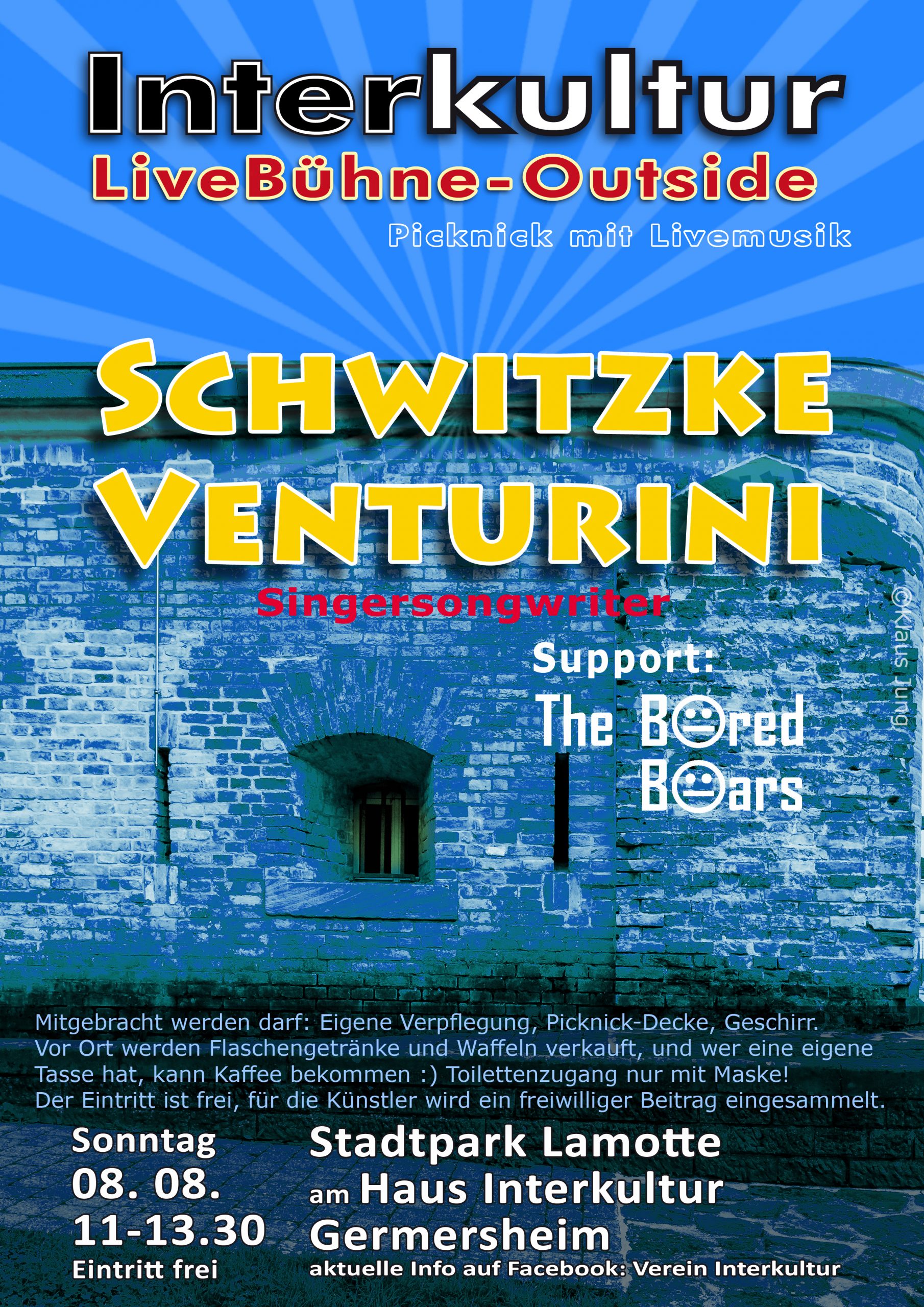 Es werden Getränke, Kaffee und etwas Kleines zum Essen angeboten, eigene Picknickverpflegung ist ebenfalls erlaubt. Bei schlechtem Wetter wird die Veranstaltung abgesagt oder verschoben. Dies wird bekanntgegeben unter: