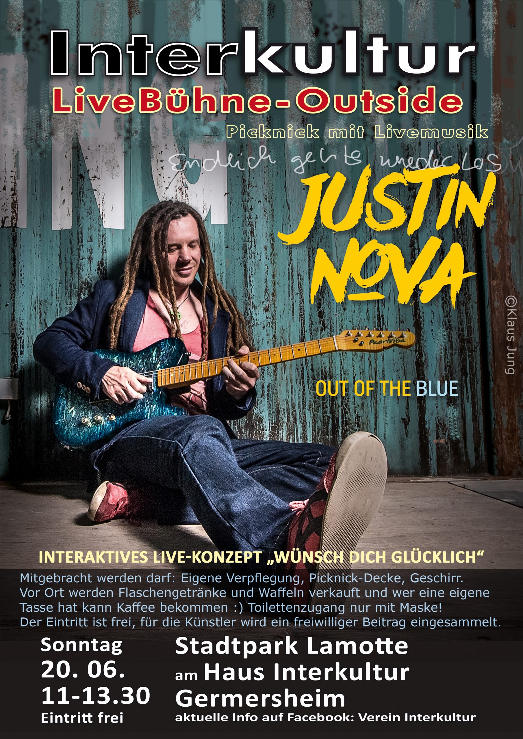 Der Verein Interkultur nimmt am 20. Juni seine Interkultur Live-Outside-Reihe wieder auf – mit dem Künstler Justin Nova und einem Picknick im Lamotte-Park Ende Reduitstraße. Das Konzert beginnt ab 11 Uhr und klingt gegen 13:30 Uhr aus. Natürlich coronakonform im Freien, mit Abstand und nur bei passendem Wetter (unbedingt Infos unten beachten)!